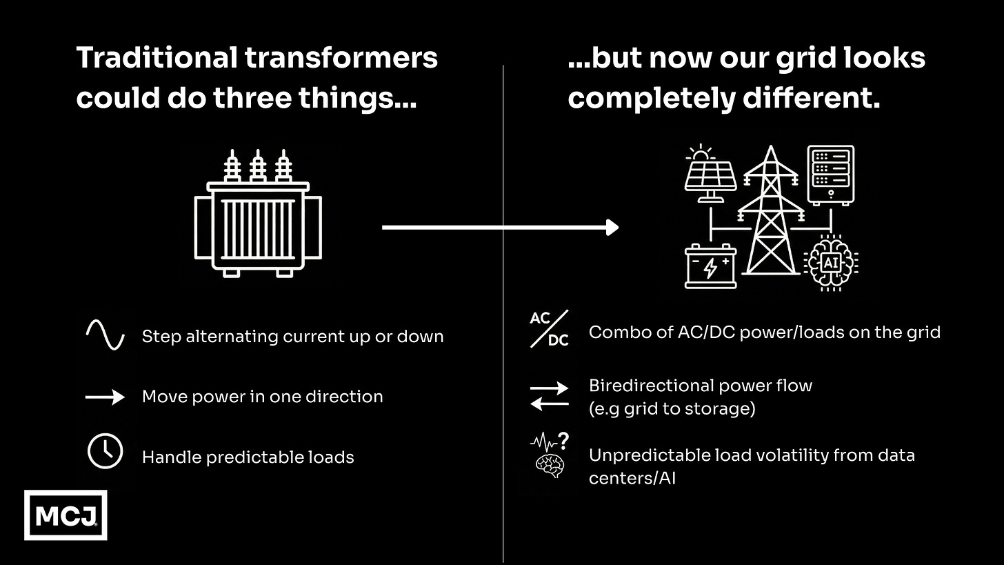 At MCJ, we look for the technologies that lift these constraints. Solid-state transformers allow the grid to modernize beyond its original architecture, unlocking a more flexible, intelligent, and bidirectional power system.