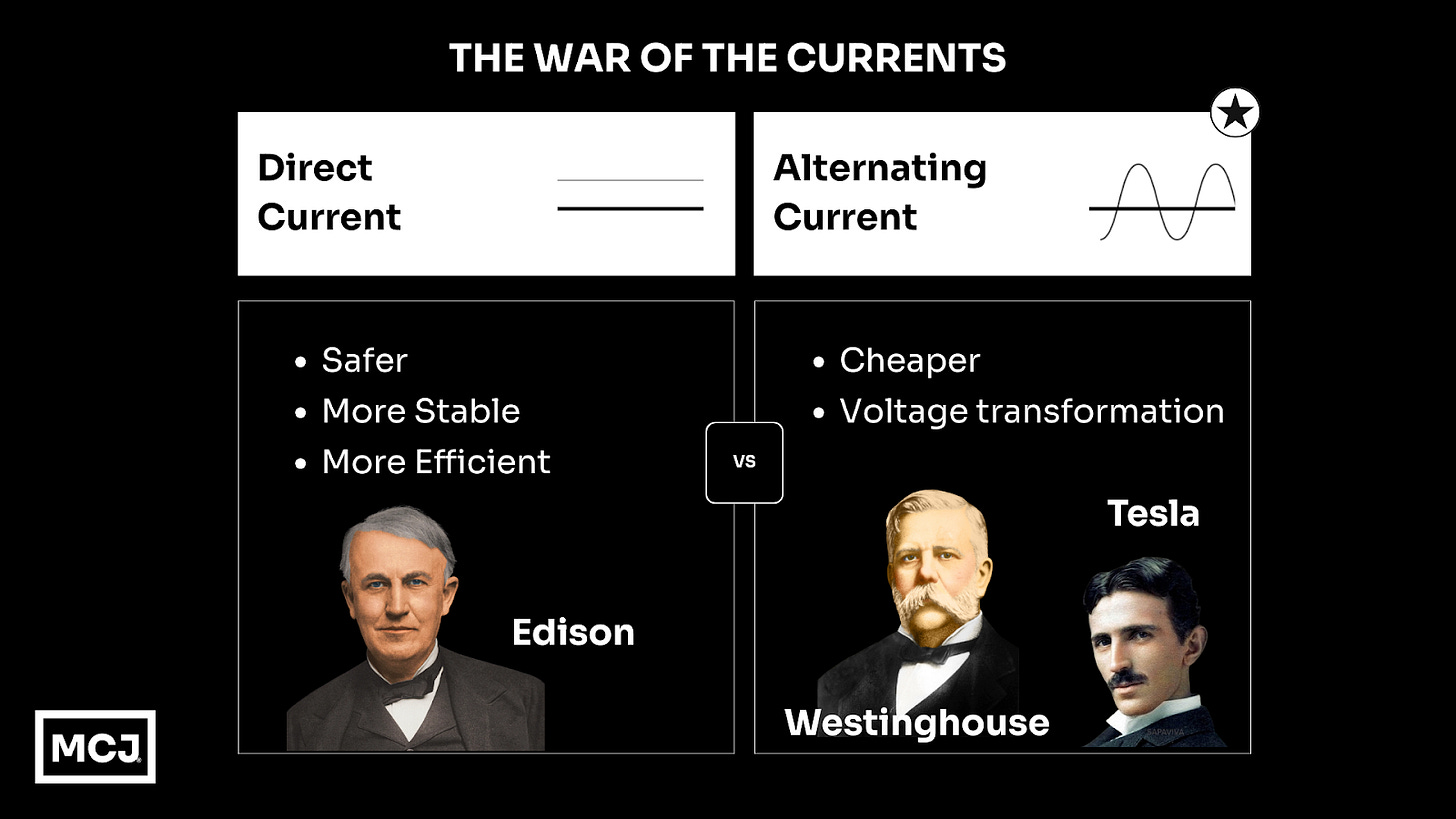 Thomas Edison, Nikola Tesla, and George Westinghouse viciously fought over one essential question: should we power our electric grid with alternating current (AC) or direct current (DC)?