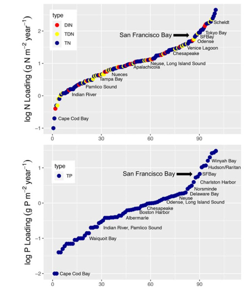 The truth about this summer’s red tide and fish kill is that San Francisco Bay is among the most enriched for nitrogen and phosphorus compounds (“nutrients”) of any estuary in the world (Figure 1). These nutrients – which are food for algae – come primarily from treated wastewater effluent from dozens of sewage treatment plants that surround the Bay. Researchers have long predicted that nutrient enrichment would fuel a large harmful algae bloom because parts of the Bay Area are generally warm and sunny enough to support such blooms during the summer. So, while climate change will likely make harmful algal blooms more frequent, conditions necessary to support them exist already, even without climate change.