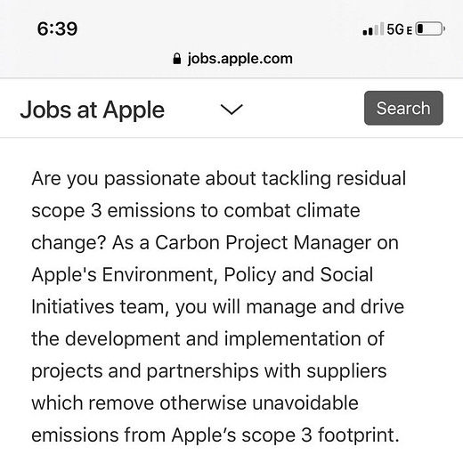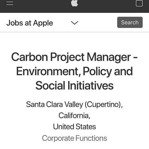 2) A job posting from Apple for a Carbon Project Manager! There is a whole set of skill sets that these big companies will need to fundamentally transition how they do things, and new jobs will be created, new skillsets will be needed, and these people will need to get educated and trained somewhere. Lots of opportunities for impact and profit!